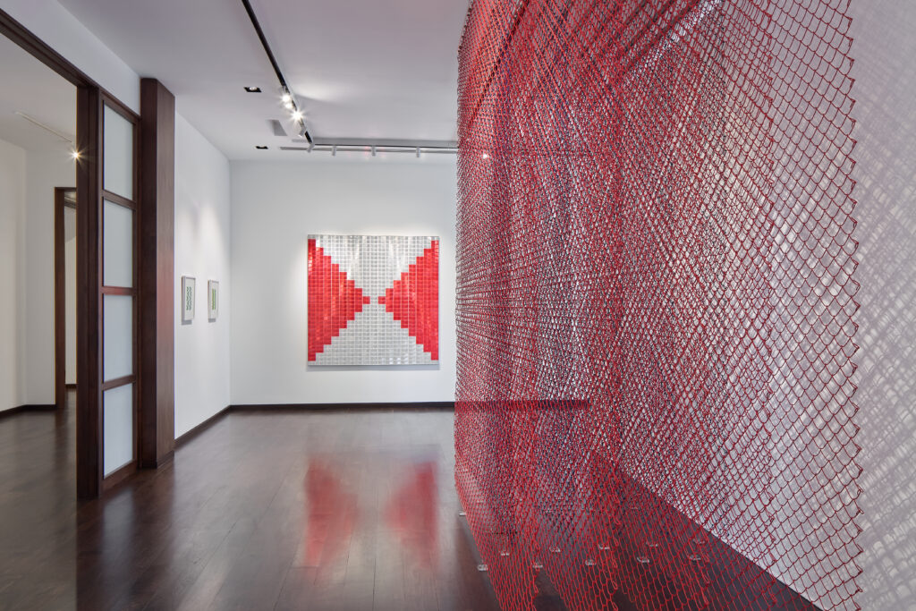 Unique to The Gallery at Windsor’s iteration is a new mesh sculpture, recently created by Ms. Begum, and the outdoor presentation of three large-scale sculptures situated in the Clubhouse’s lush courtyard, where the vibrant red, green, yellow, and white bicycle light reflectors that Ms. Begum uses to clad her sculptures are refracted in the central reflecting pool.