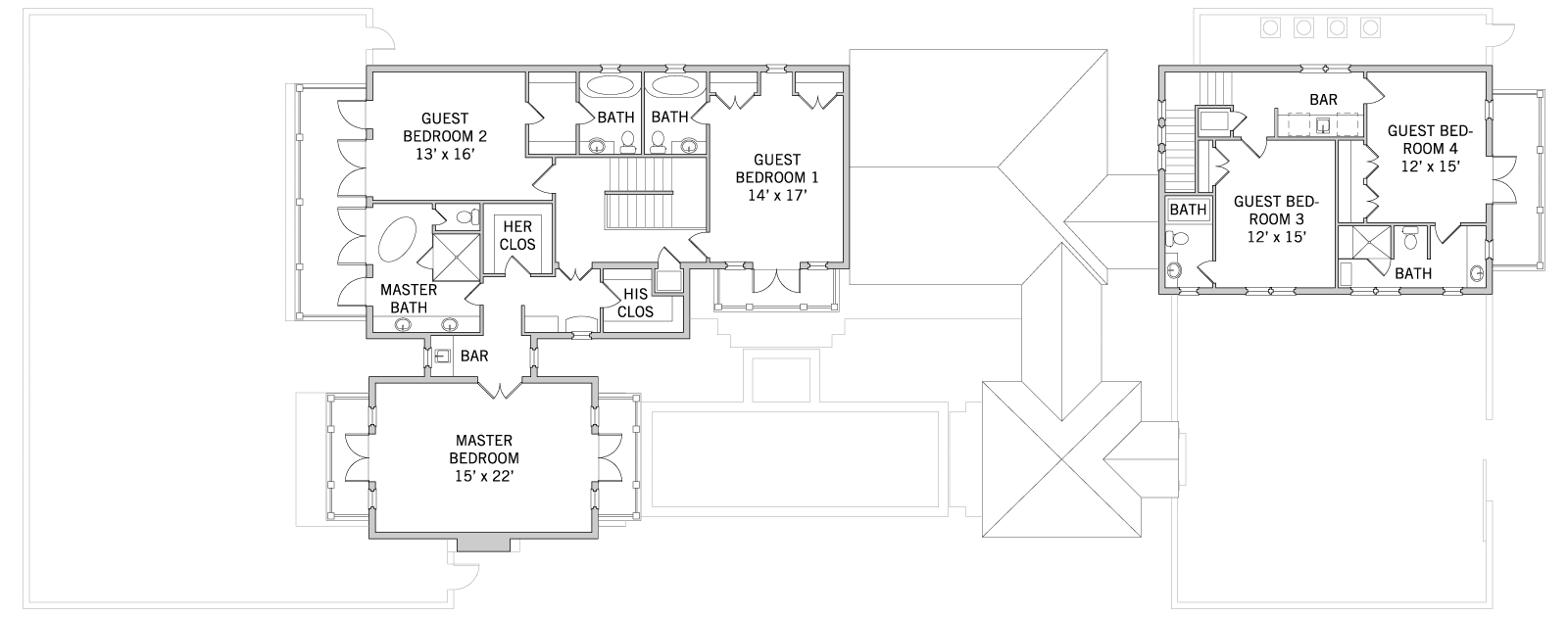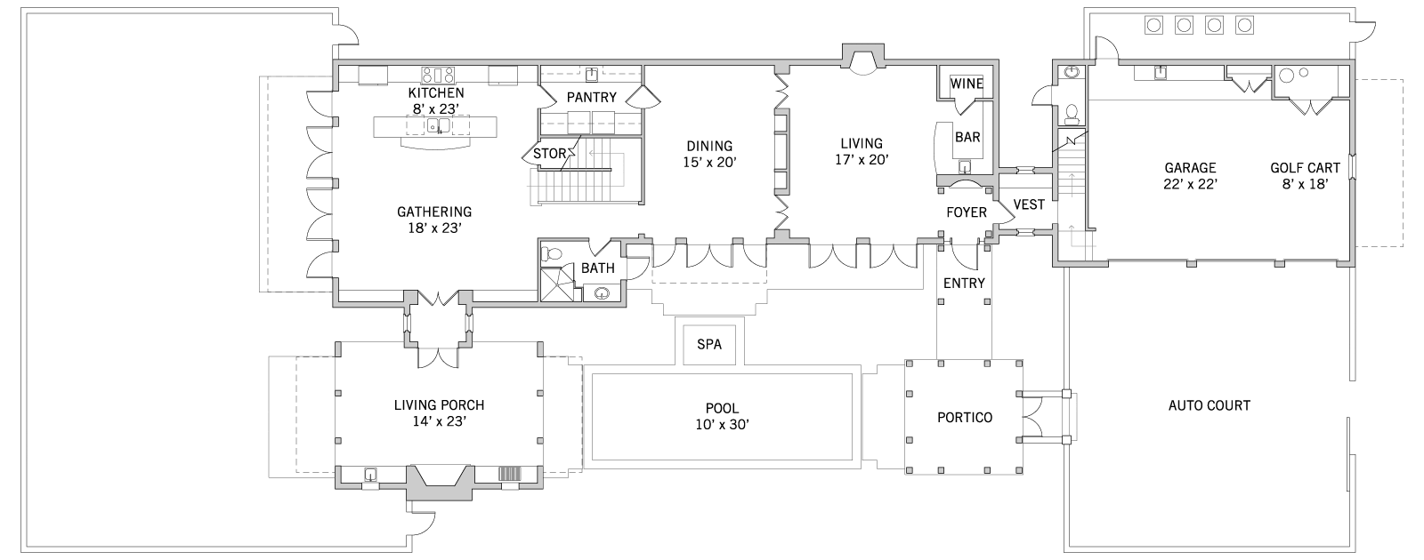 Upon arrival, the covered portico entry leads your eye down the centerline of the pool, through the spacious living porch and to the golf course beyond. The living room complete with fireplace, wine room and wet bar, features inverted hip ceilings with white painted beams. Sets of tall French doors with transoms above open onto the sunny pool courtyard and enhance the home’s light and airy feel. On the second floor, the master bedroom is architecturally isolated from the additional bedrooms, creating an intimate retreat. Covered verandas on both sides of the master capture stunning views of the golf course and pool courtyard below. A private stairway accessible from the main home and garage leads to the two-bedroom carriage house.