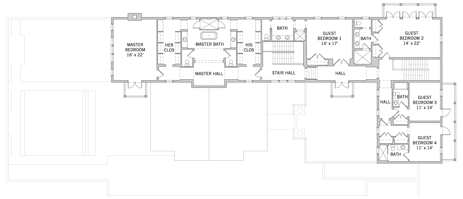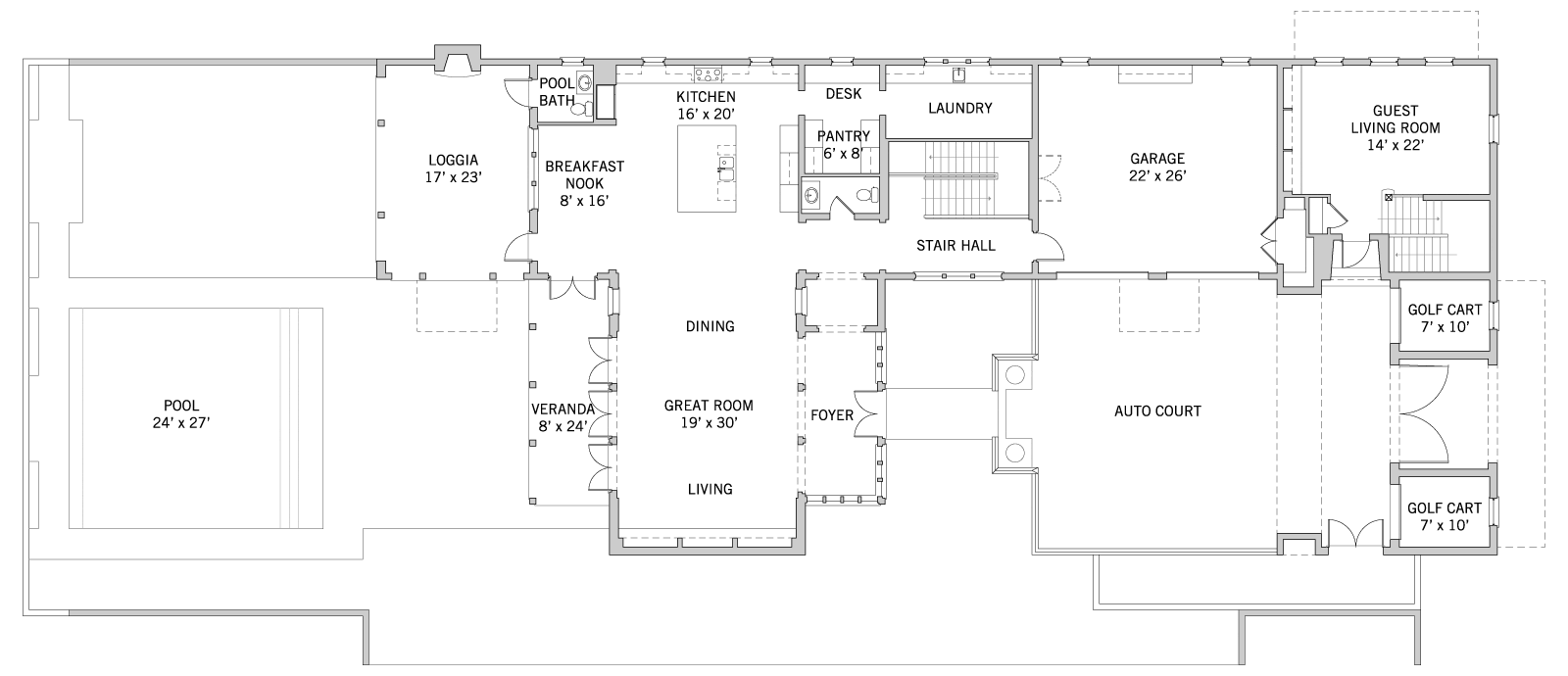 A large pool is surrounded by a series of layered outdoor spaces linking to the indoor social areas. Designed for entertaining, this plan features a large kitchen with a central island and cozy breakfast nook. The kitchen flows into the dining and living spaces of the great room creating a perfect setting for large gatherings. All bedrooms within the home are located on the second floor, with the master suite enjoying breathtaking views of the golf course and pool courtyard below. This flexible plan offers guests maximum privacy with a separate entry off the auto court.