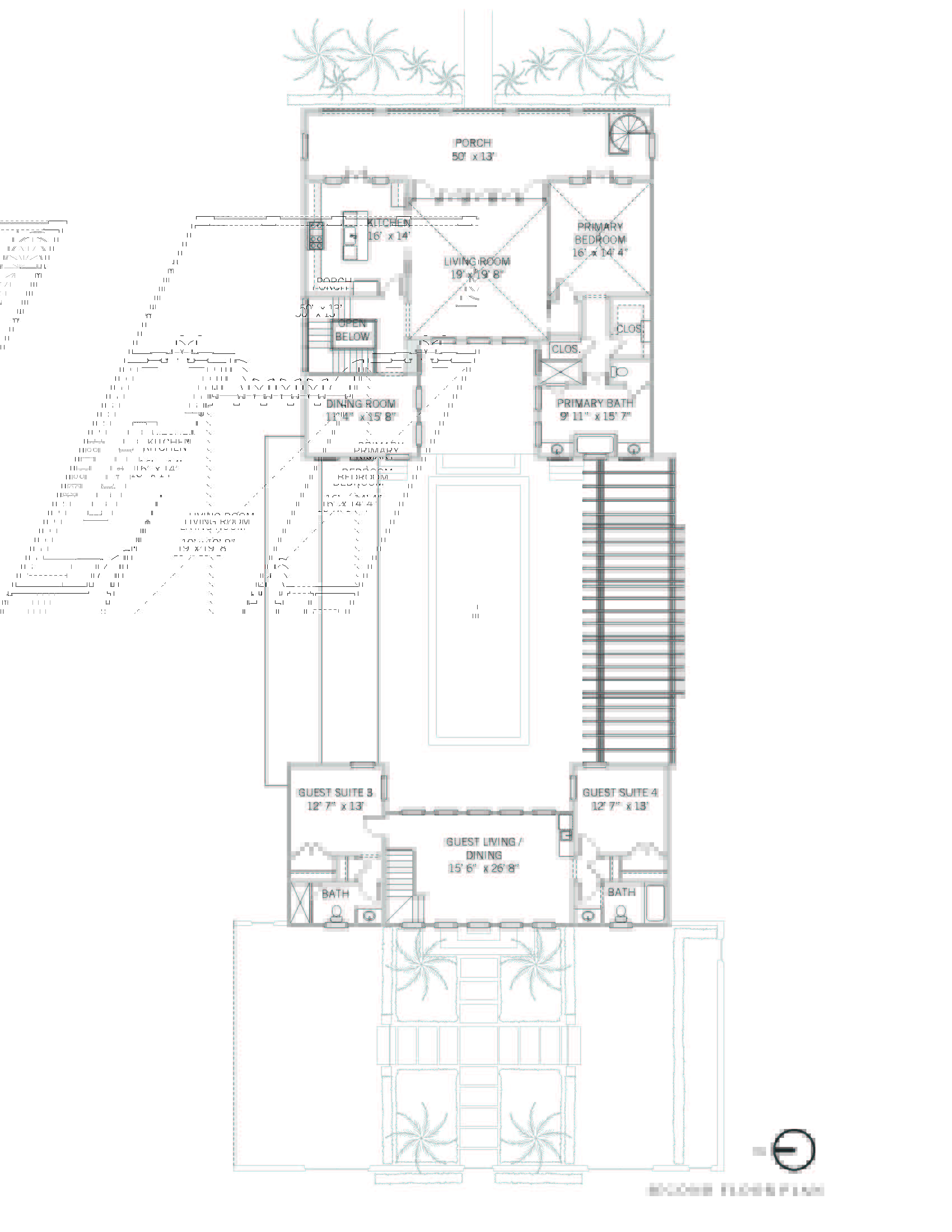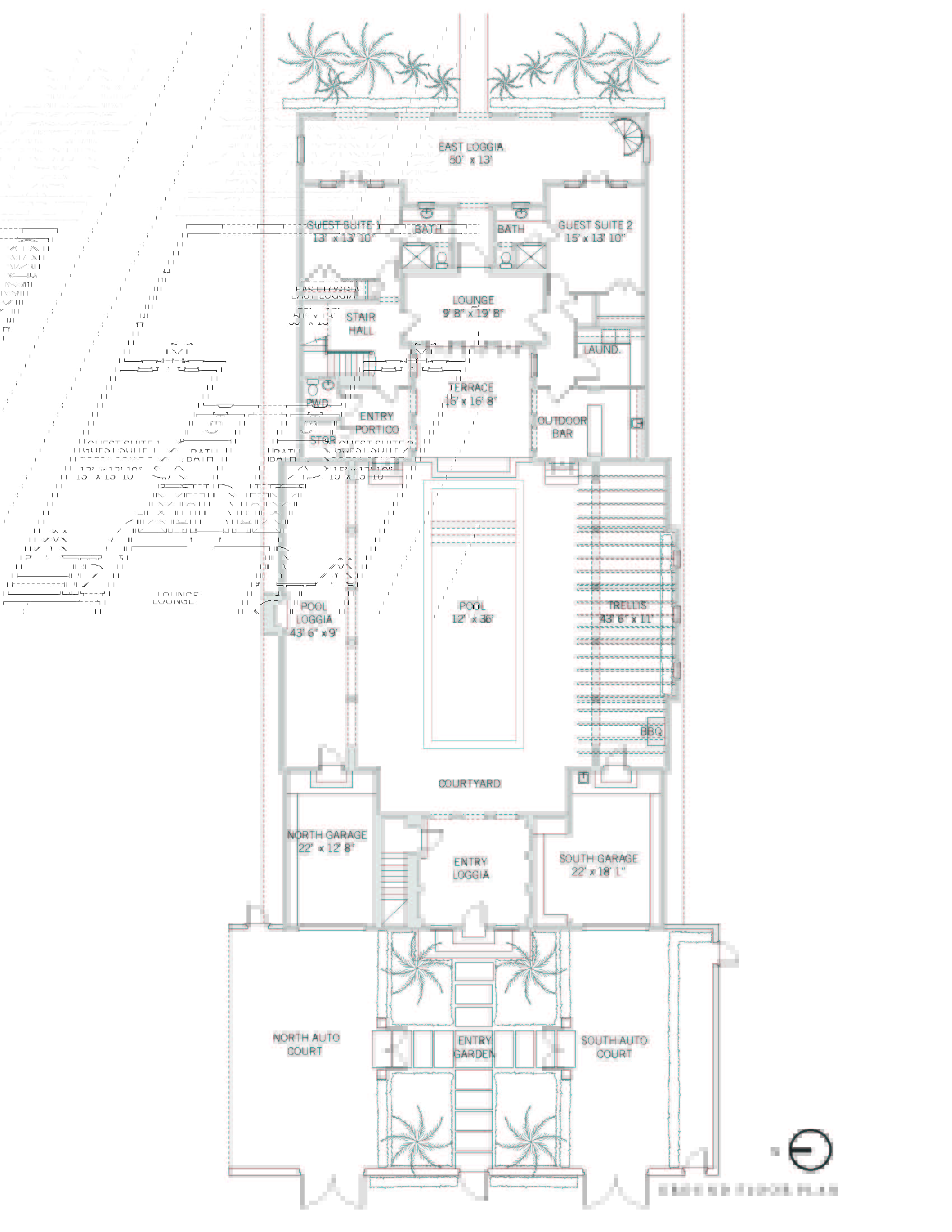 The second-floor primary suite is an airy retreat with vaulted wood ceilings that opens to the covered ocean-facing porch. A hallway with custom walk-in closets leads to the spacious marble-clad master bath with a deep soaking tub and a separate shower. Four guest suites, each with an en-suite bathroom, are thoughtfully located to offer privacy and comfort. Two guest suites on the ground floor of the main home open to an oceanside loggia with views into the dune hammock. The two second-floor carriage house guest suites have east-facing views over the pool courtyard and open to a shared living and dining room with a wet bar.